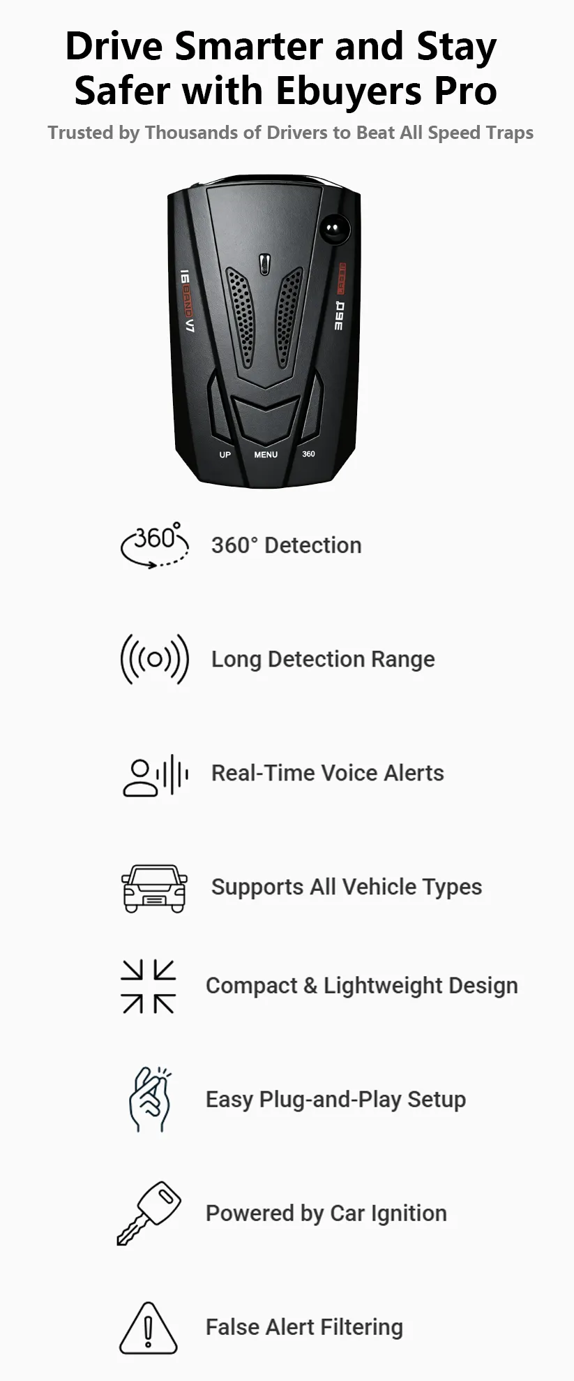 Ebuyers Pro ensures you’re never caught off guard by speed traps. It’s more than just a radar detector – it’s your key to safer, stress-free driving.